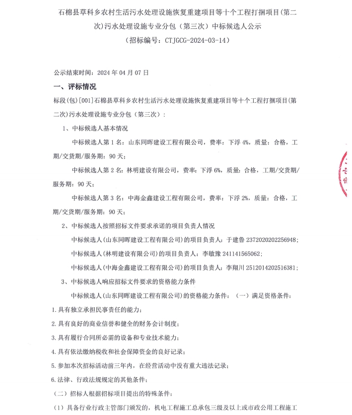 石棉縣草科鄉(xiāng)農(nóng)村生活污水處理設(shè)施恢復(fù)重建項目等十個工程打捆項目(第二次)污水處理設(shè)施專業(yè)分包(第三次)中標(biāo)候選人公示
