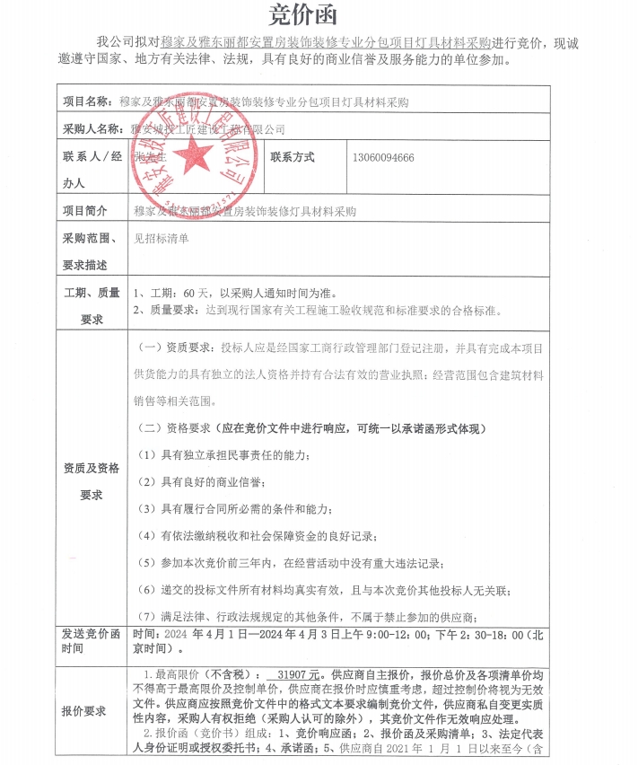 穆家及雅東麗都安置房裝飾裝修專業(yè)分包項目燈具材料采購競價公告
