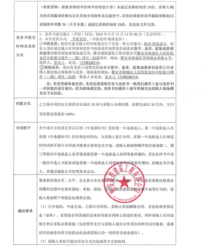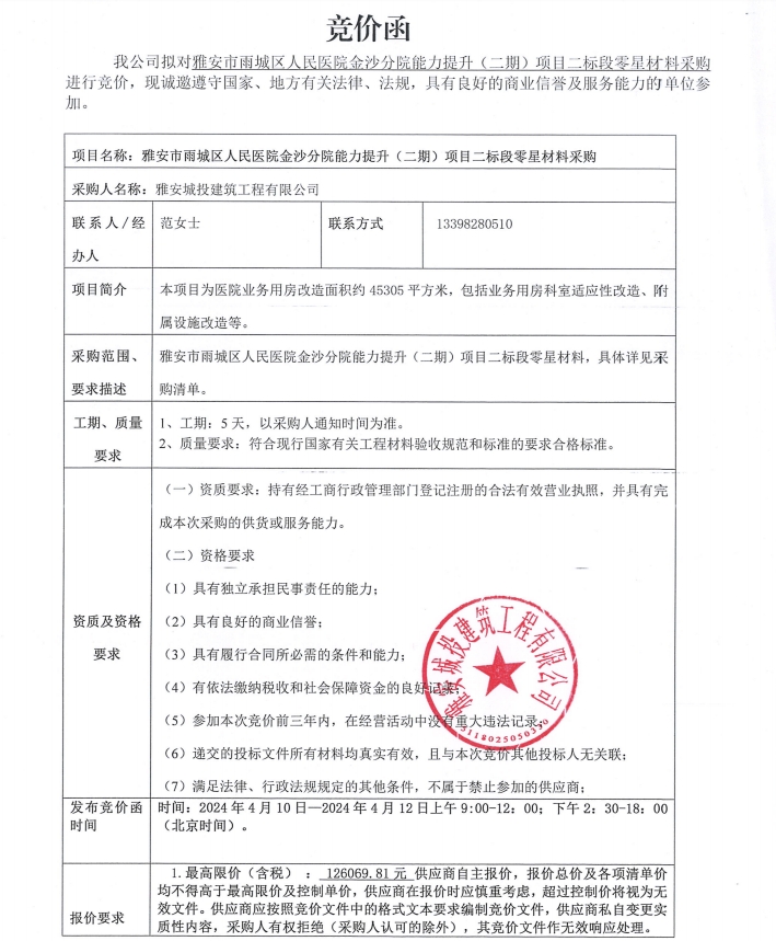 雅安市雨城區(qū)人民醫(yī)院金沙分院能力提升(二期)項(xiàng)目二標(biāo)段零星材料采購競(jìng)價(jià)公告