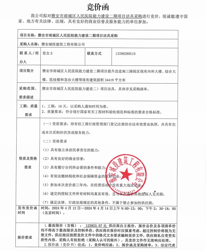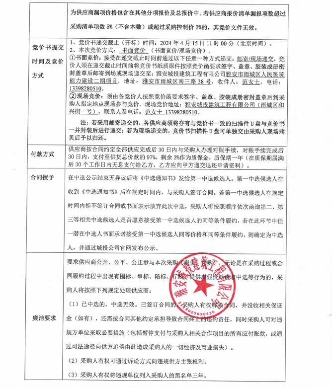 雅安市雨城區(qū)人民醫(yī)院能力建設(shè)二期項(xiàng)目潔具采購競價(jià)公告