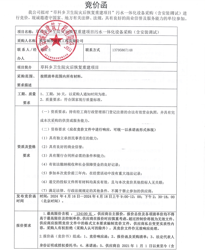 草科鄉(xiāng)衛(wèi)生院災(zāi)后恢復(fù)重建項目污水一體化設(shè)備采購(含安裝調(diào)試)競價公告