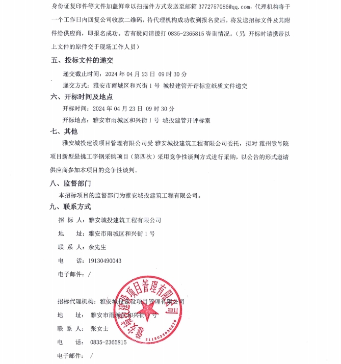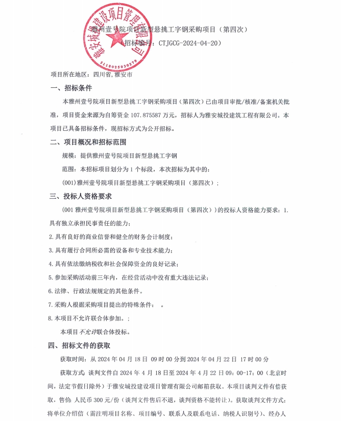 雅州壹號院項目新型懸挑工字鋼采購項目(第四次)公告