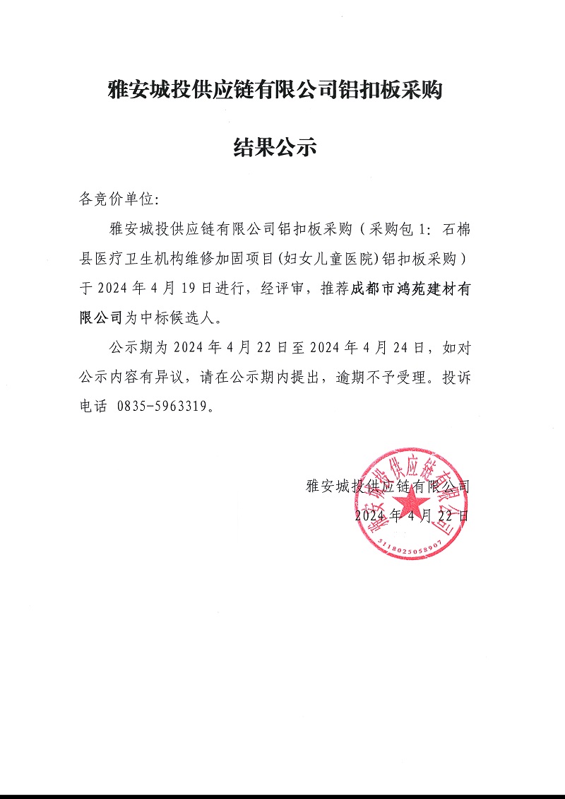 雅安城投供應(yīng)鏈有限公司鋁扣板采購(gòu)結(jié)果公示