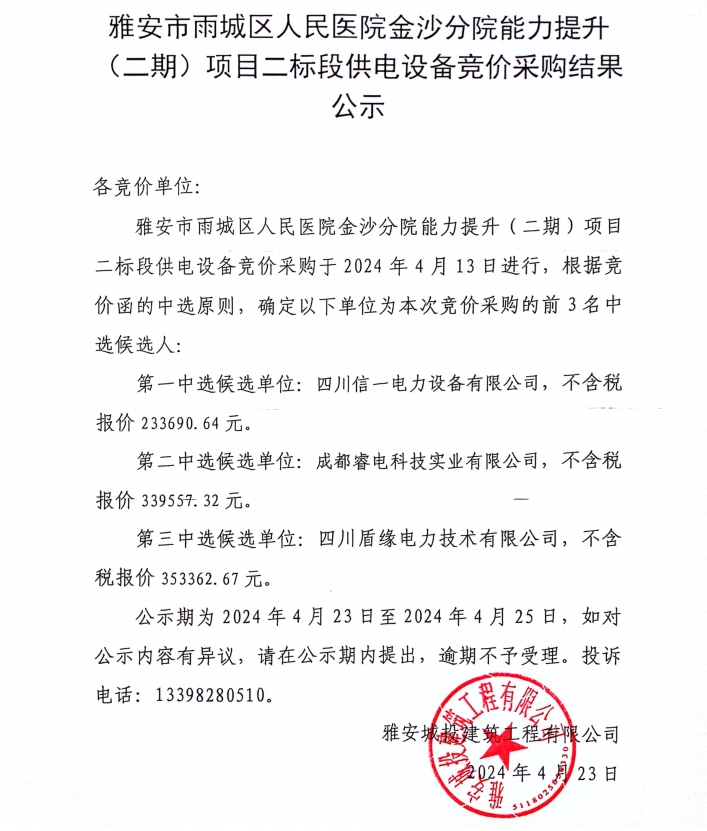 雅安市雨城區(qū)人民醫(yī)院金沙分院能力提升(二期)項(xiàng)目二標(biāo)段供電設(shè)備競(jìng)價(jià)采購(gòu)結(jié)果公示