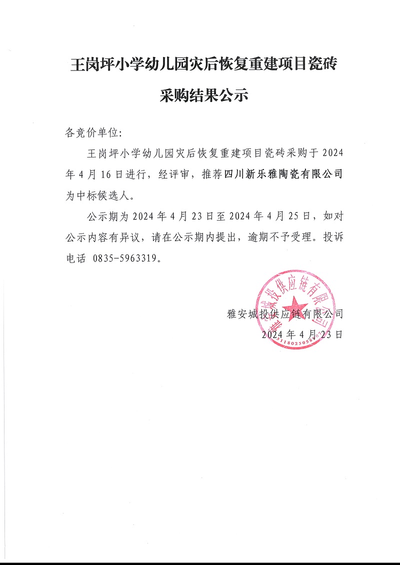 王崗坪小學(xué)幼兒園災(zāi)后恢復(fù)重建項(xiàng)目瓷磚采購(gòu)結(jié)果公示