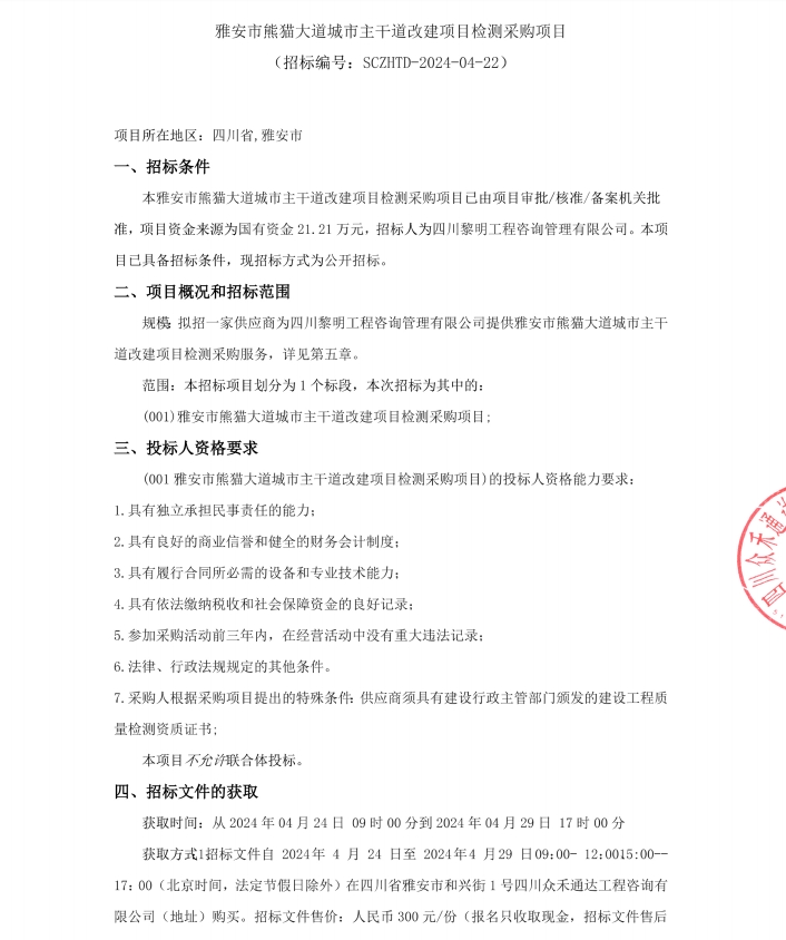雅安市熊貓大道城市主干道改造項(xiàng)目檢測(cè)采購項(xiàng)目公告