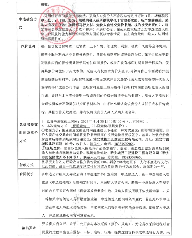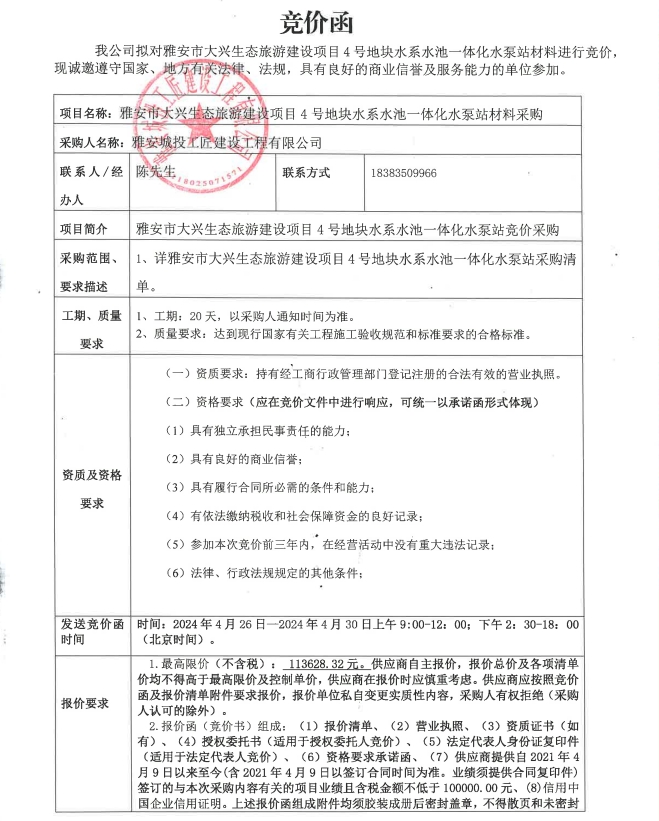 雅安市大興生態(tài)旅游建設項目4號地塊水系水池一體化水泵站材料采購競價公告