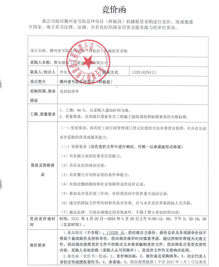 雅州壹號院總坪項目(樣板段)機械租賃采購競價公告