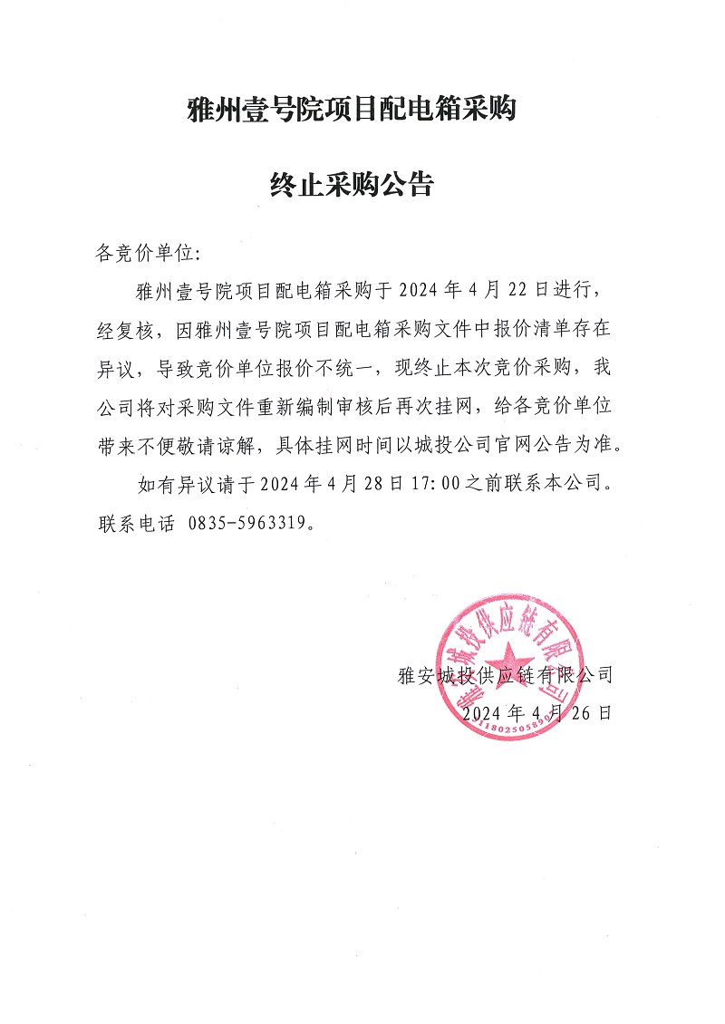 雅州壹號(hào)院項(xiàng)目配電箱采購(gòu)終止采購(gòu)公告