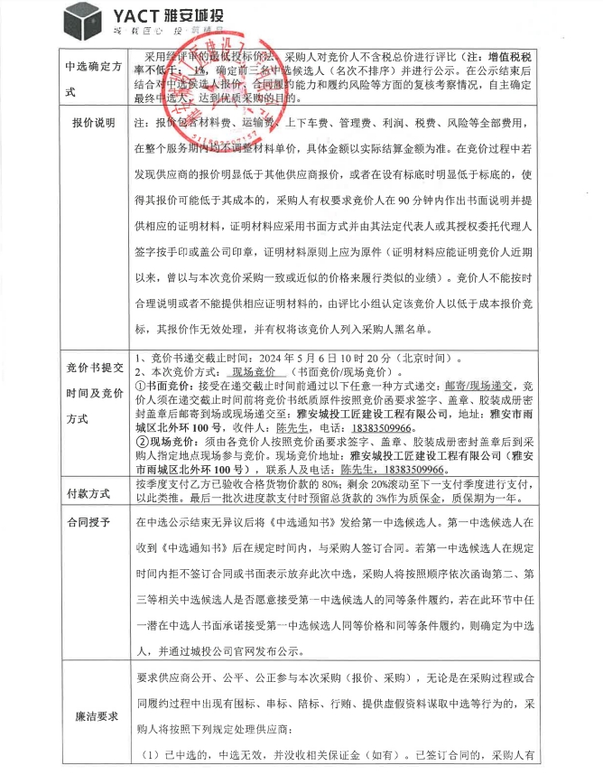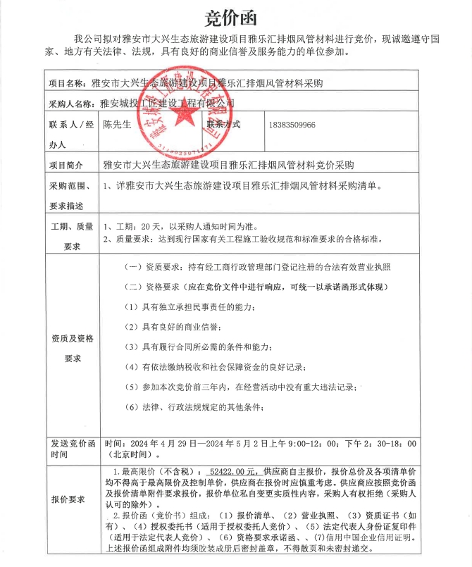 雅安市大興生態(tài)旅游建設(shè)項目雅樂匯排煙風(fēng)管材料采購競價公告