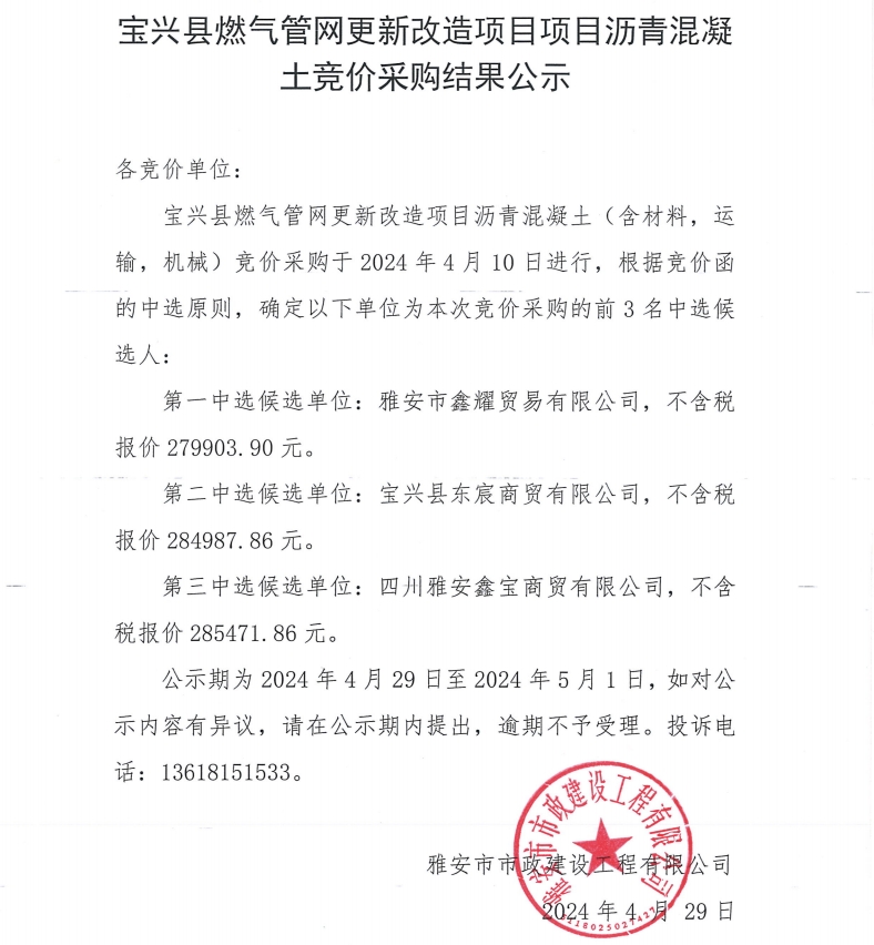 寶興縣燃?xì)夤芫W(wǎng)更新改造項(xiàng)目瀝青混凝土競(jìng)價(jià)采購結(jié)果公示