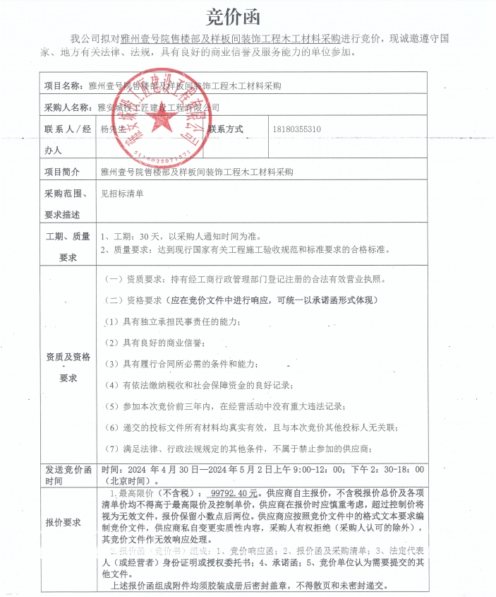 附件:競價函-木工材料采購-雅州壹號院售樓部及樣板間