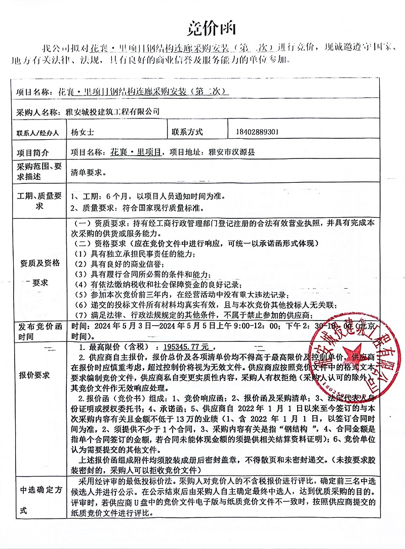 花襄·里項(xiàng)目鋼結(jié)構(gòu)連廊采購(gòu)安裝(第二次)競(jìng)價(jià)公告