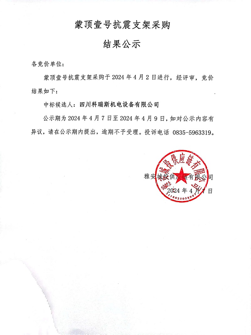 蒙頂壹號(hào)抗震支架采購(gòu)結(jié)果公示