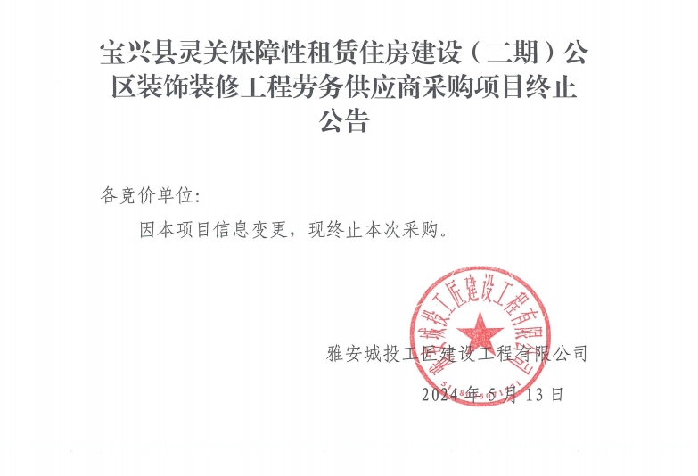 寶興縣靈關保障性租賃住房建設(二期)公區(qū)裝飾裝修工程勞務供應商采購項目終止公告