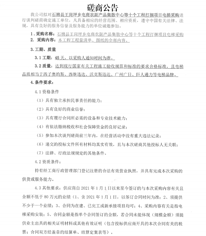 石棉縣王崗坪鄉(xiāng)電商農(nóng)副產(chǎn)品集散中心等十個(gè)工程打捆項(xiàng)目電梯采購磋商公告