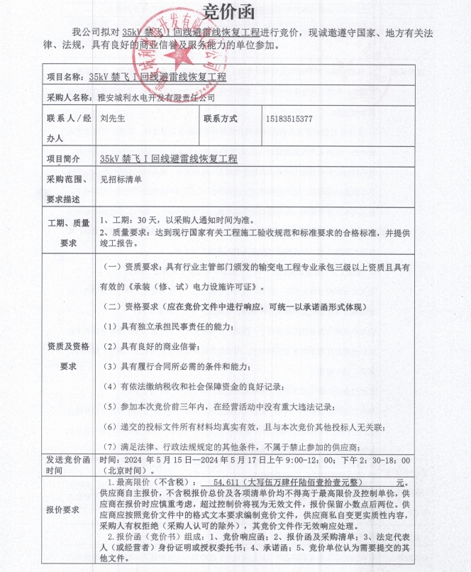 35kV禁飛I回線避雷線恢復(fù)工程競價公告