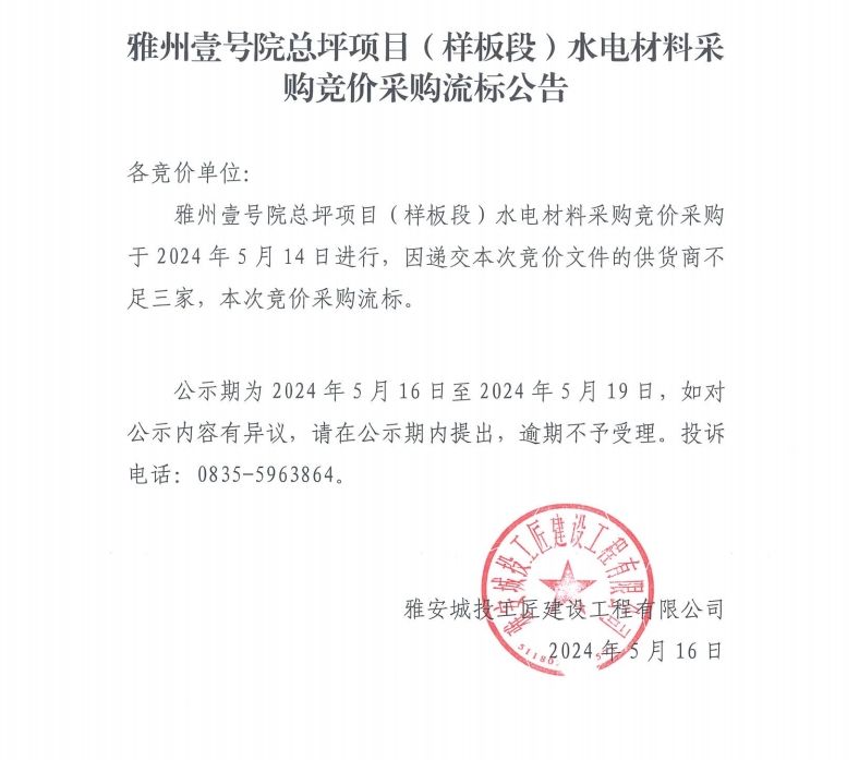 雅州壹號(hào)院總坪項(xiàng)目(樣板段)水電材料采購(gòu)競(jìng)價(jià)采購(gòu)流標(biāo)公告