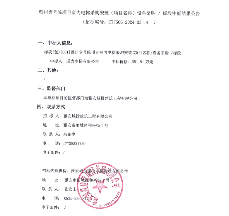 雅州壹號(hào)院項(xiàng)目室內(nèi)電梯采購(gòu)安裝(項(xiàng)目名稱(chēng))設(shè)備采購(gòu)/標(biāo)段中標(biāo)結(jié)果公告