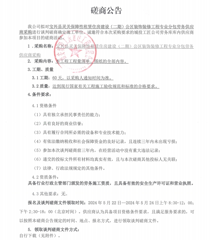 寶興縣靈關(guān)保障性租賃住房建設(shè)(二期)公區(qū)裝飾裝修工程專(zhuān)業(yè)分包勞務(wù)供應(yīng)商采購(gòu)談判磋商公告