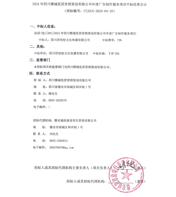 2024年四川雅城優(yōu)居營銷策劃有限公司年度廣告制作服務(wù)項目中標(biāo)結(jié)果公示