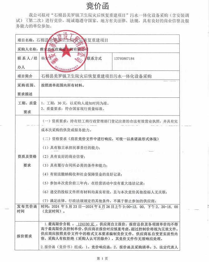 石棉縣美羅鎮(zhèn)衛(wèi)生院災(zāi)后恢復(fù)重建項(xiàng)目污水一體化設(shè)備材料采購(第二次)競價(jià)公告