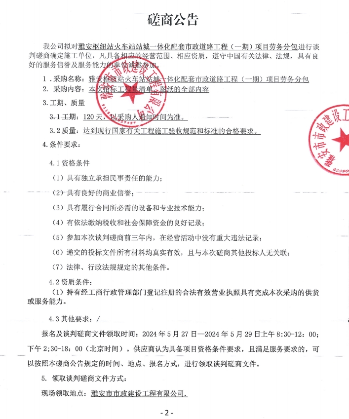 雅安樞紐站火車站站城一體化配套市政道路工程(一期)項目勞務分包磋商公告