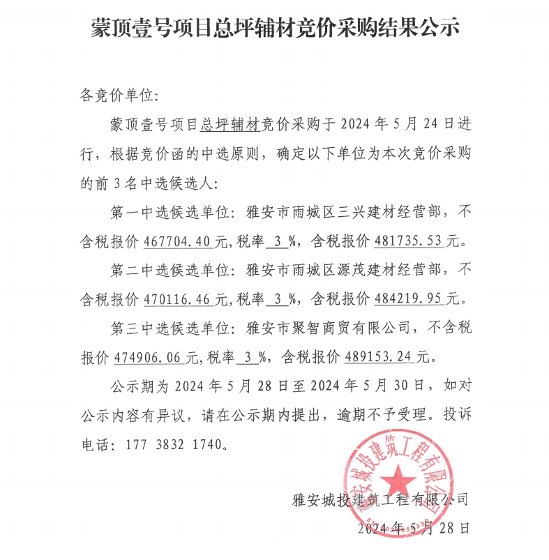 蒙頂壹號項(xiàng)目總坪輔材競價(jià)采購結(jié)果公示