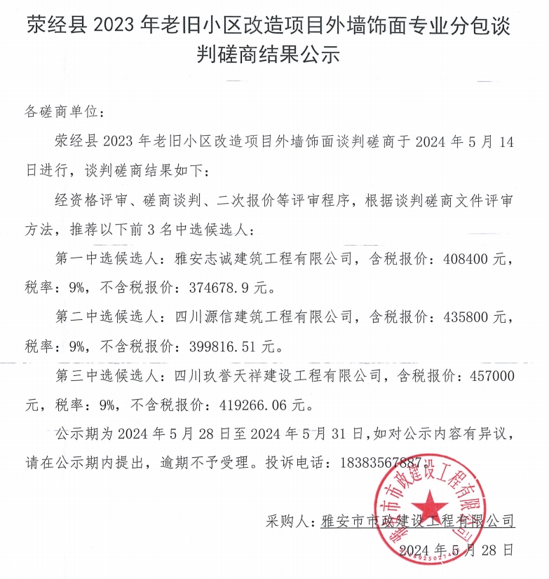 滎經(jīng)縣2023年老舊小區(qū)改造項(xiàng)目外墻飾面專業(yè)分包談判磋商結(jié)果公示