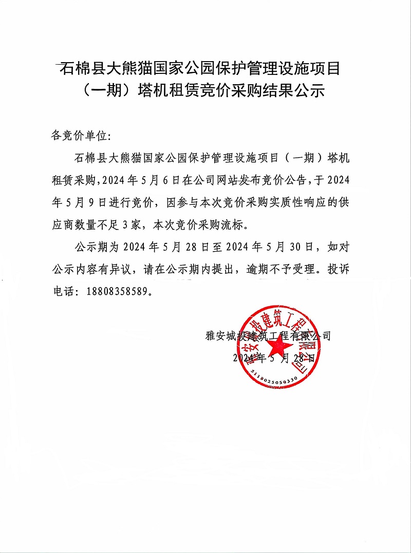 石棉縣大熊貓國家公園保護(hù)管理設(shè)施項目(一期)塔機租賃競價采購結(jié)果公示