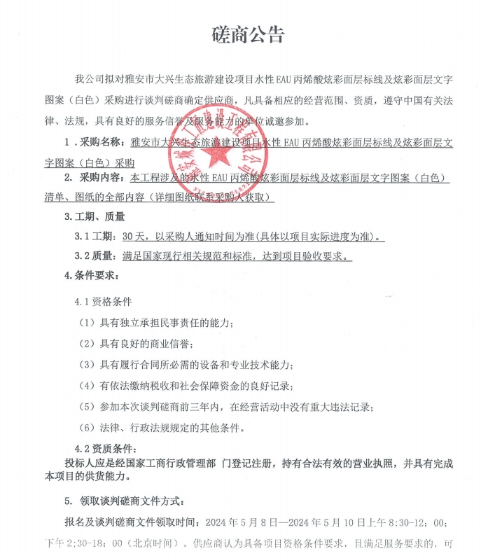 雅安市大興生態(tài)旅游建設(shè)項目水性EAU丙烯酸炫彩面層標線及炫彩面層文字圖案(白色)采購磋商公告