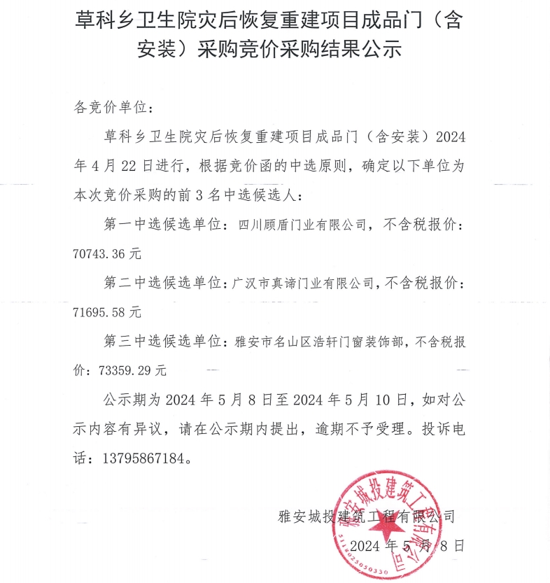 草科鄉(xiāng)衛(wèi)生院災(zāi)后恢復(fù)重建項(xiàng)目成品門(含安裝)采購(gòu)競(jìng)價(jià)采購(gòu)結(jié)果公示