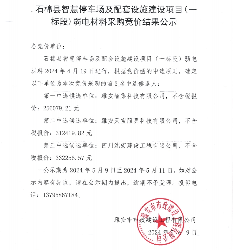 石棉縣智慧停車場(chǎng)及配套設(shè)備建設(shè)項(xiàng)目(一標(biāo)段)弱電材料采購(gòu)競(jìng)價(jià)結(jié)果公示