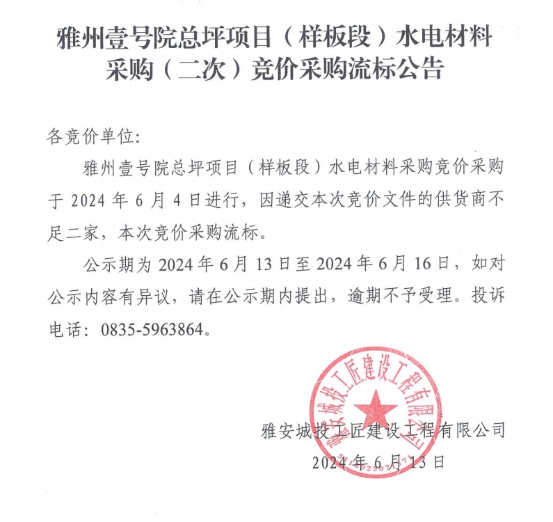 雅州壹號(hào)院總坪項(xiàng)目(樣板段)水電材料采購(二次)競價(jià)采購流標(biāo)公告