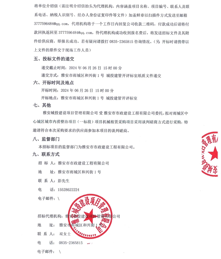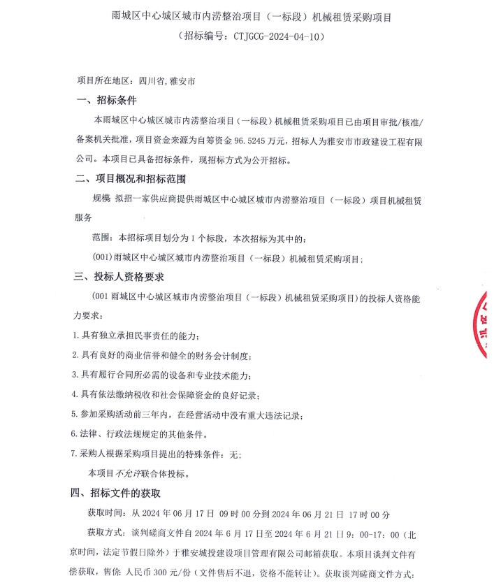 雨城區(qū)中心城區(qū)城市內(nèi)澇整治項目(一標(biāo)段)項目機(jī)械租賃采購項目招標(biāo)公告