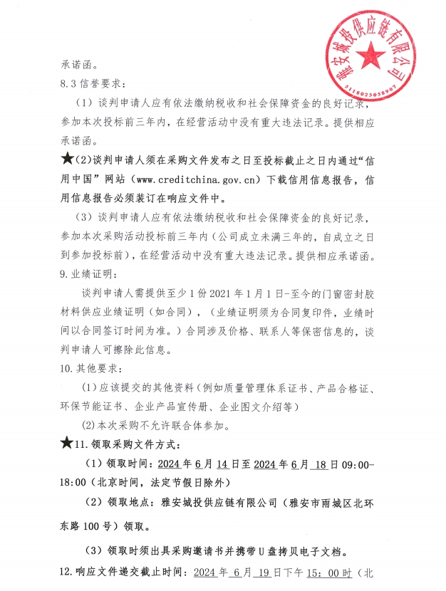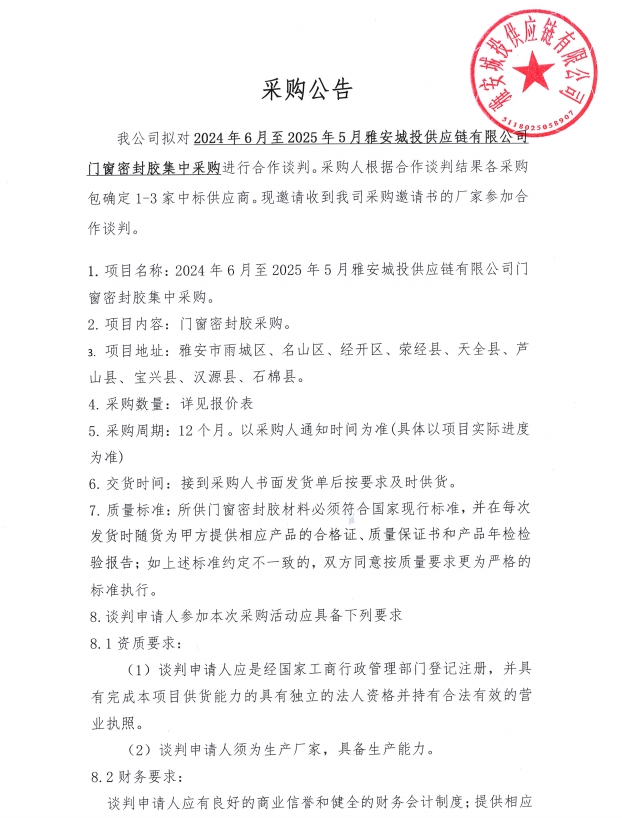 2024年6月至2025年5月雅安城投供應(yīng)鏈有限公司門(mén)窗密封膠集中采購(gòu)公告