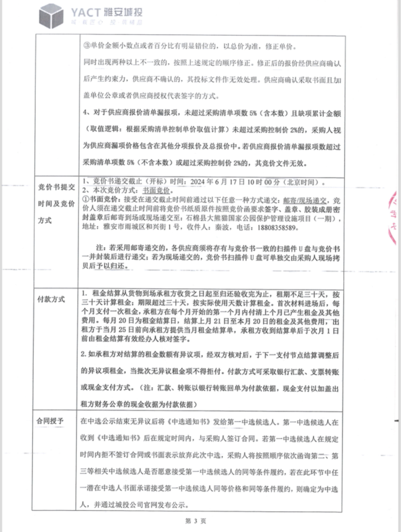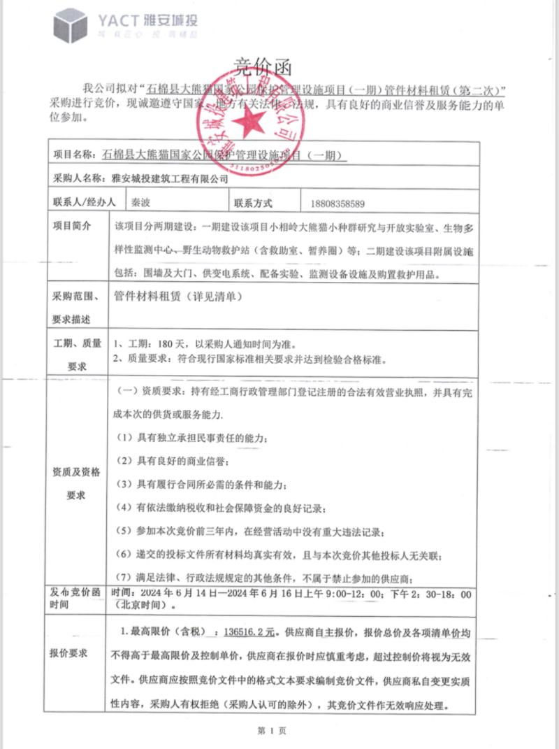 石棉縣大熊貓國家公園保護(hù)管理設(shè)施項(xiàng)目(一期)管件材料租賃(第二次)競(jìng)價(jià)公告