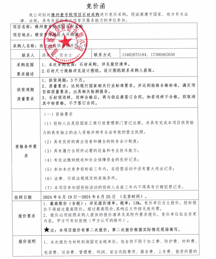 雅州壹號(hào)院項(xiàng)目石材采購競價(jià)公告