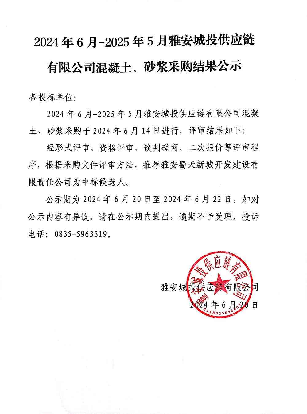 2024年6月-2025年5月雅安城投供應(yīng)鏈有限公司混凝土、砂漿采購(gòu)結(jié)果公示