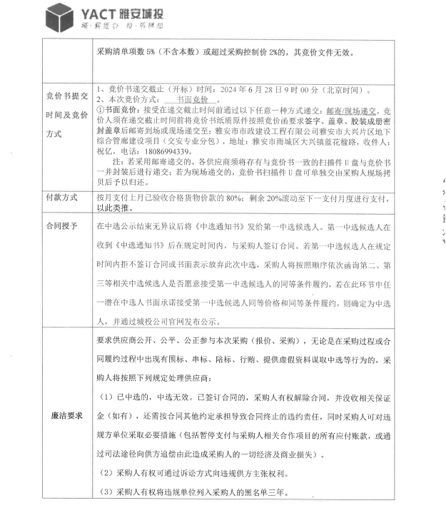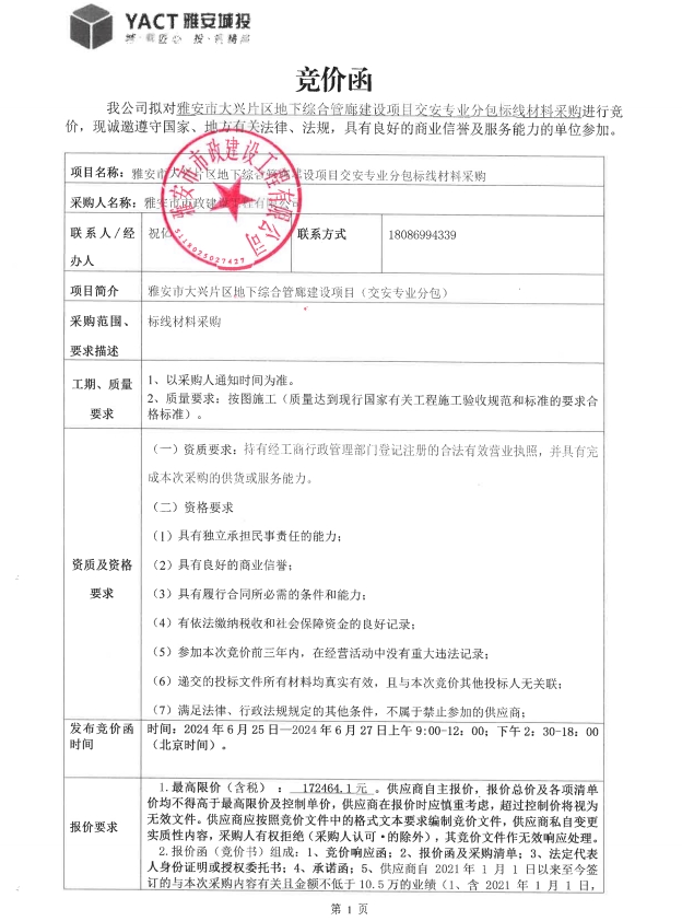 雅安市大興片區(qū)地下綜合管廊建設項目交安專業(yè)分包標線材料采購競價公告