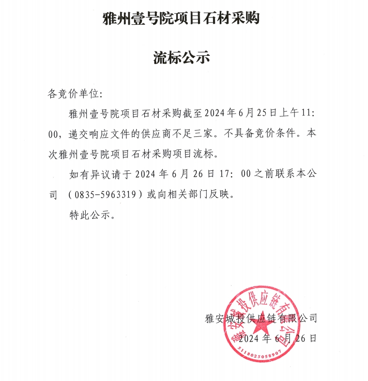 雅州壹號院項目石材采購流標公示