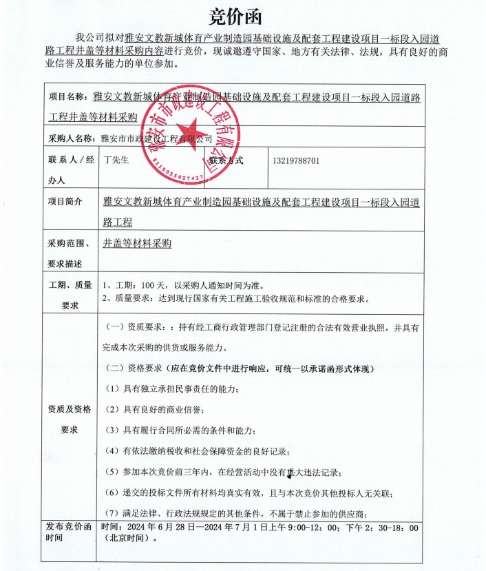 雅安文教新城體育產(chǎn)業(yè)制造園基礎(chǔ)設(shè)施及配套工程建設(shè)項(xiàng)目一標(biāo)段入園道路工程項(xiàng)目井蓋等材料采購競價(jià)公告