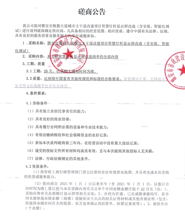 雅安市熊貓大道城市主干道改建項(xiàng)目智慧燈桿顯示屏改造(含安裝、智能化調(diào)試)磋商公告