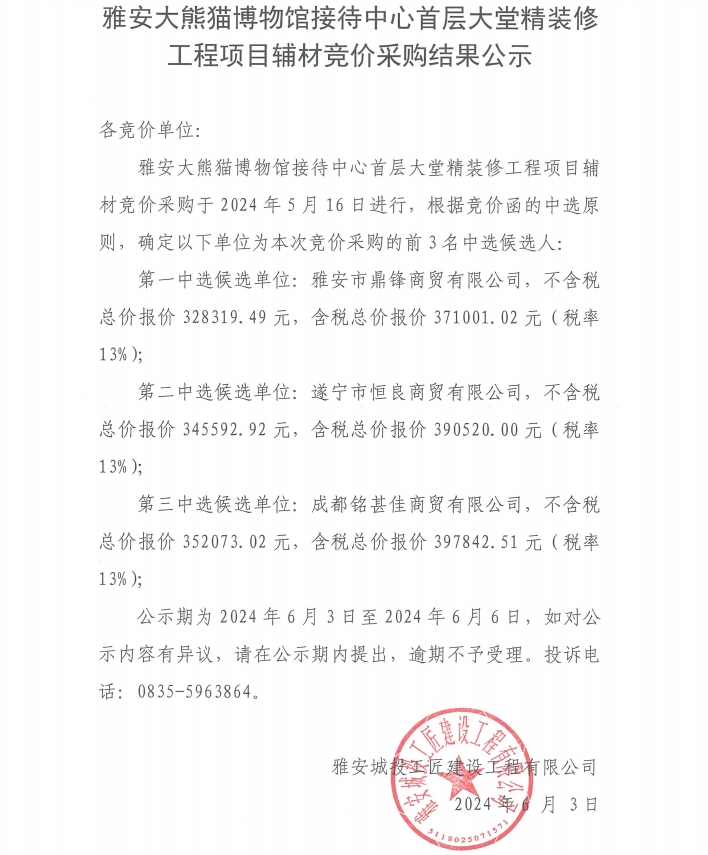 雅安大熊貓博物館接待中心首層大堂精裝修工程項目輔材競價采購結果公示