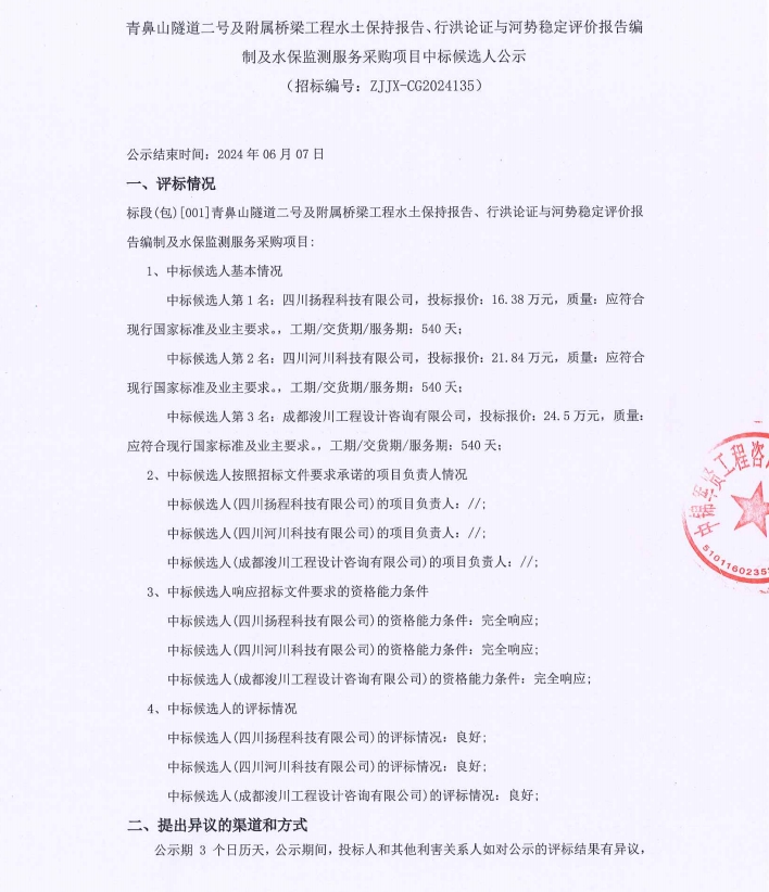 青鼻山隧道二號及附屬橋梁工程水土保持報(bào)告、行洪論證與河勢穩(wěn)定評價(jià)報(bào)告編制及水保監(jiān)測服務(wù)采購項(xiàng)目中標(biāo)候選人公示