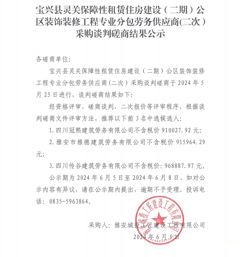 寶興縣靈關(guān)保障性租賃住房建設(shè)(二期)公區(qū)裝飾裝修工程專業(yè)分包勞務(wù)供應(yīng)商(二次)采購談判磋商結(jié)果公示