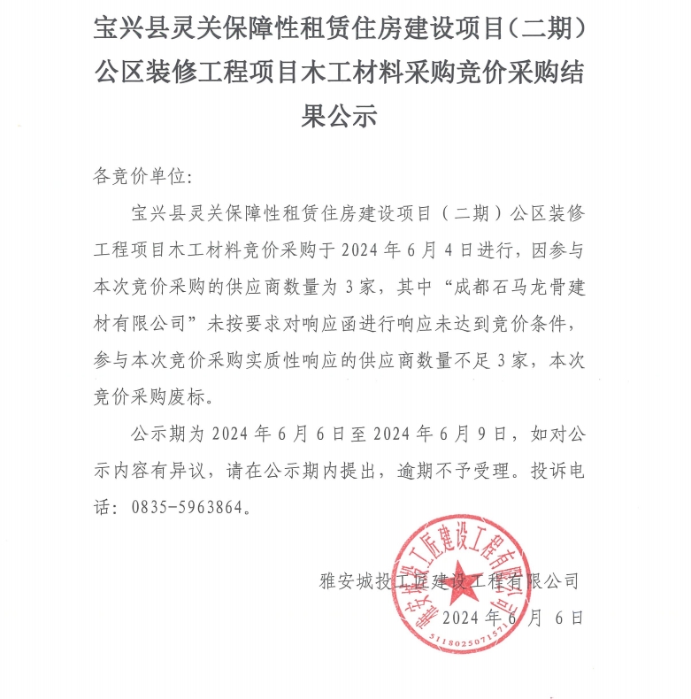 寶興縣靈關(guān)保障性租賃住房建設(shè)項(xiàng)目(二期)公區(qū)裝修工程項(xiàng)目木工材料采購競價(jià)采購結(jié)果公示