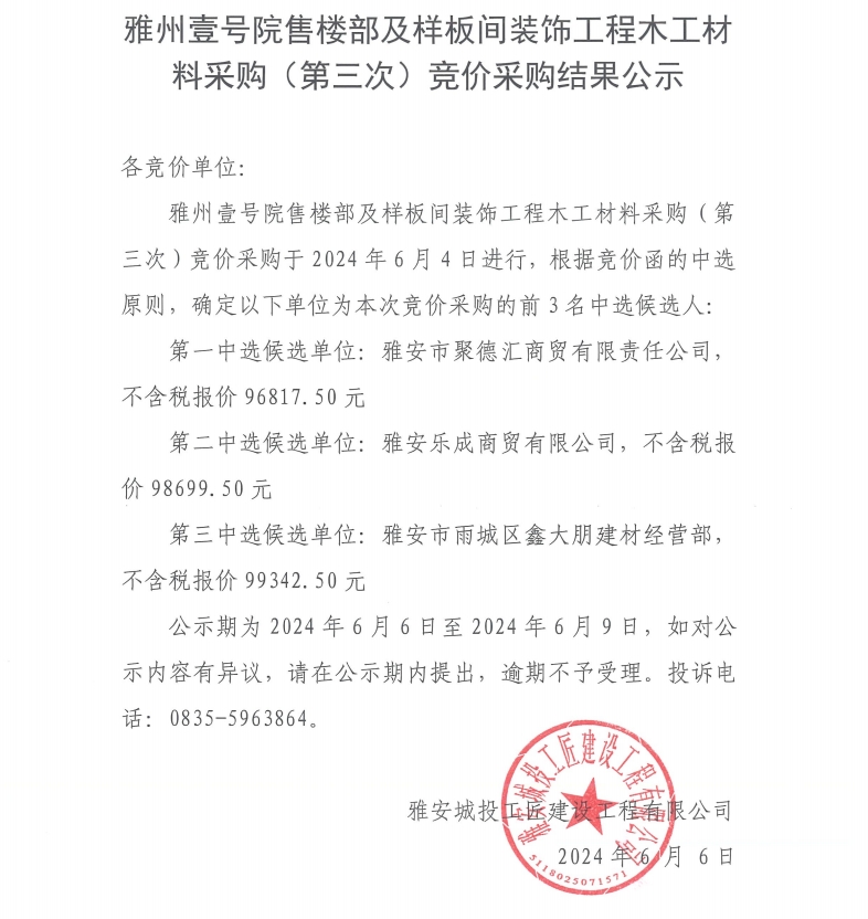 雅州壹號院售樓部及樣板間裝飾工程木工材料采購(第三次)競價采購結(jié)果公示