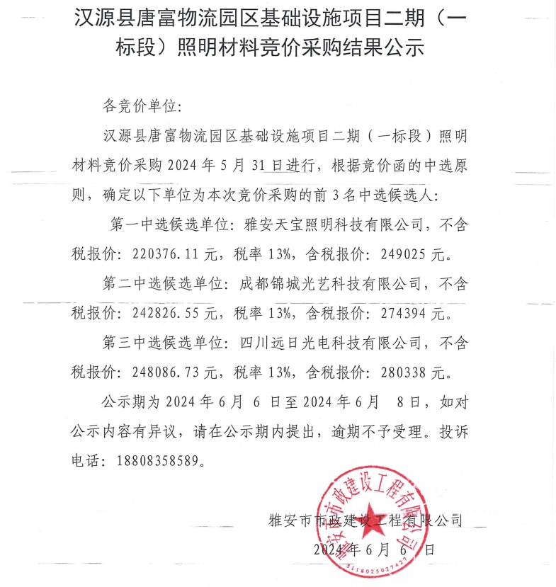 漢源縣唐富物流園區(qū)基礎(chǔ)設(shè)施項目二期(一標段)照明材料競價采購結(jié)果公示