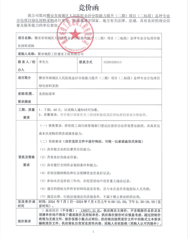 雅安市雨城區(qū)人民醫(yī)院金沙分院能力提升(二期)項(xiàng)目(二標(biāo)段)總坪專業(yè)分包項(xiàng)目綠化材料采購競價(jià)公告